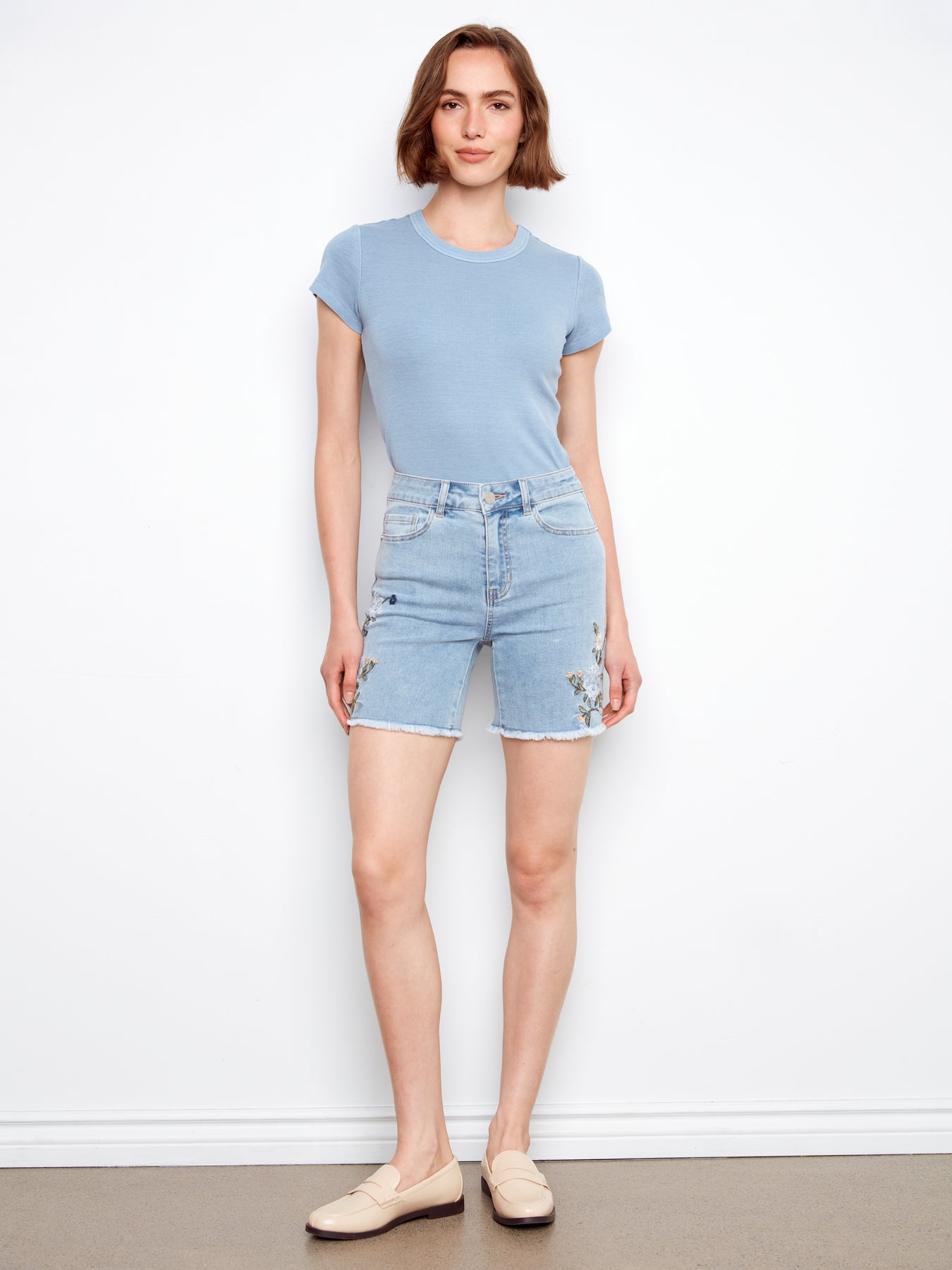 Retro vibes! Fun and fabulous 5-pocket jean short with gorgeous embroidered detail on the side. Frayed hem, too. Super chic and easy-to-wear.