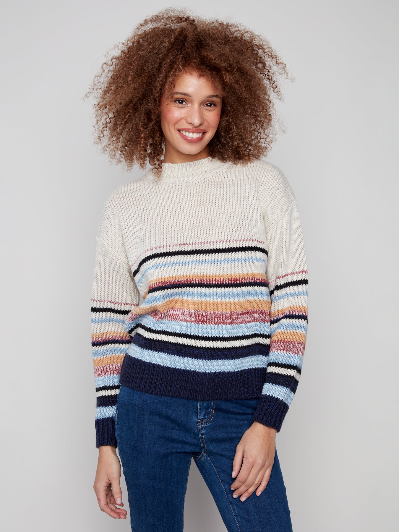 Super soft and cozy striped crew neck sweater. On trend shorter length. Ribbed cuffs and hem. Comfort and style!