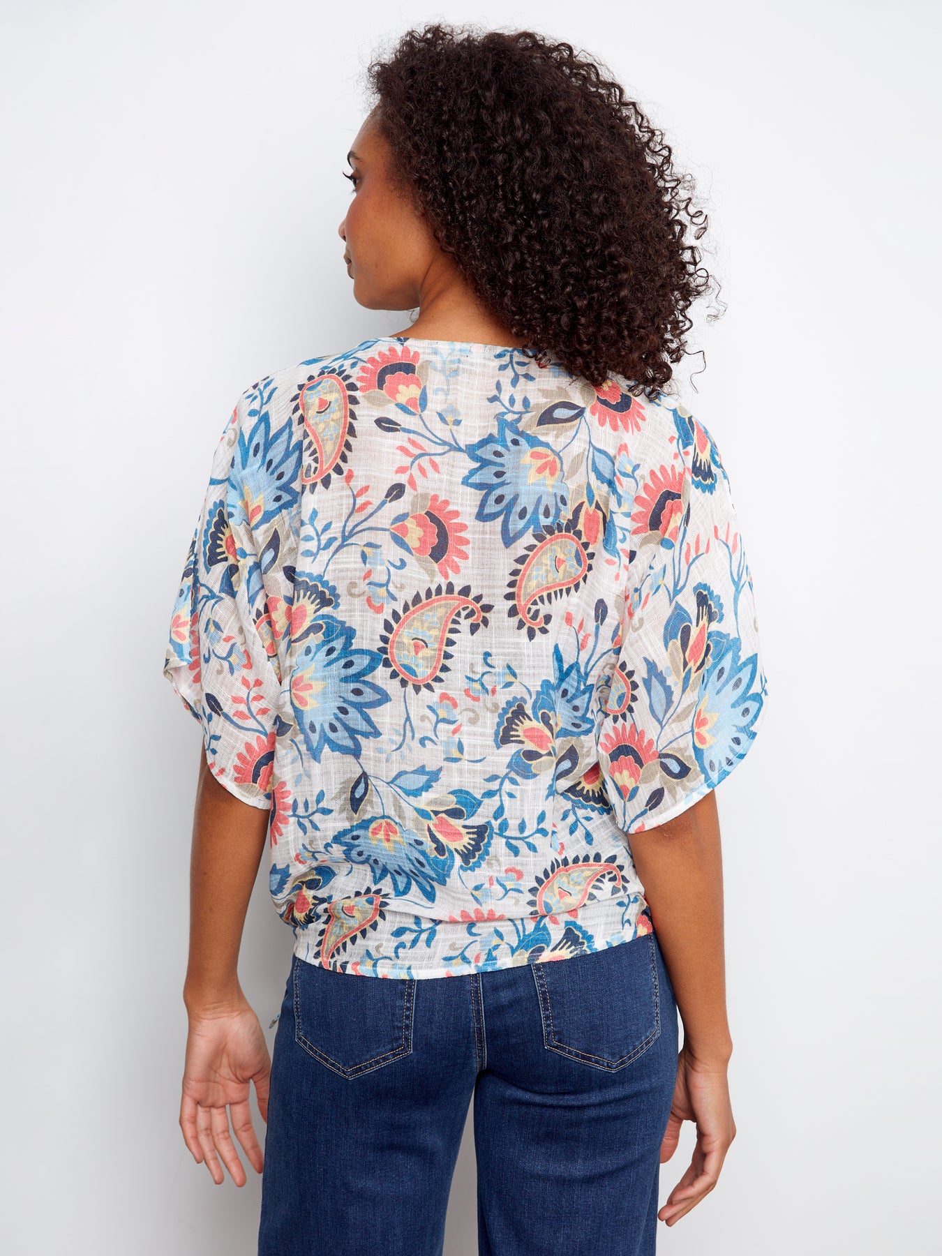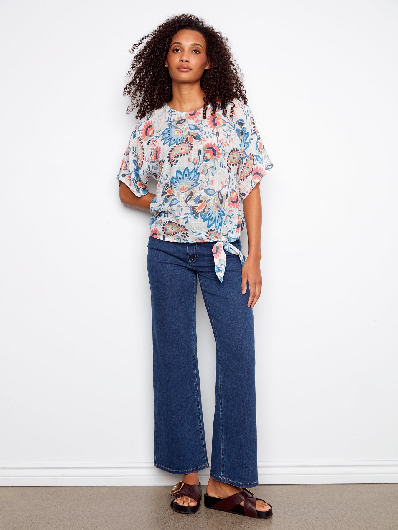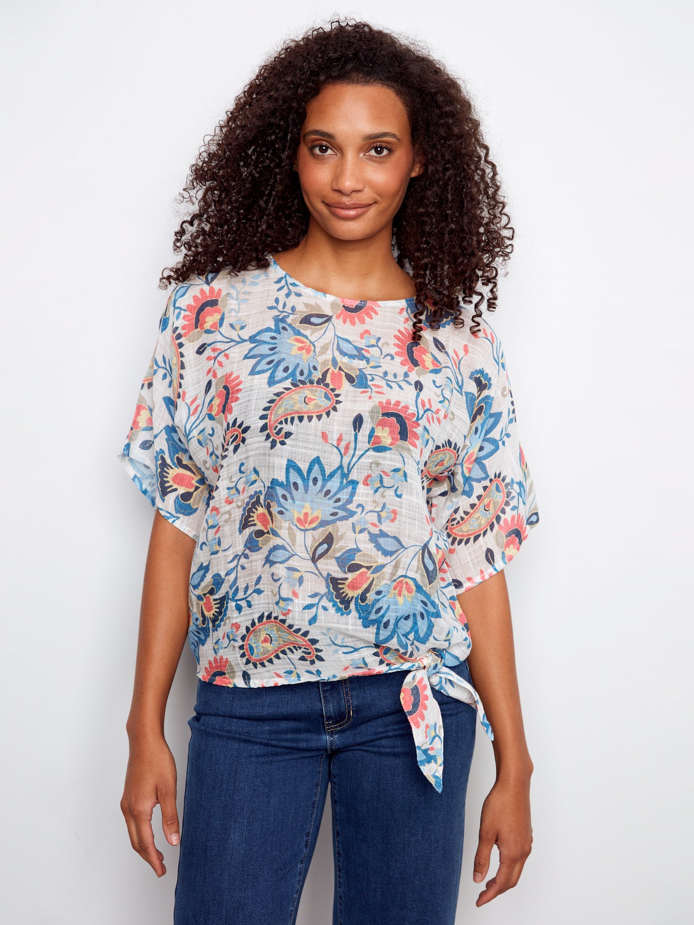Side tie cotton gauze blouse in beautiful pastel floral print. Loose fit and flowy sleeves. Very flattering and easy-to-wear.
