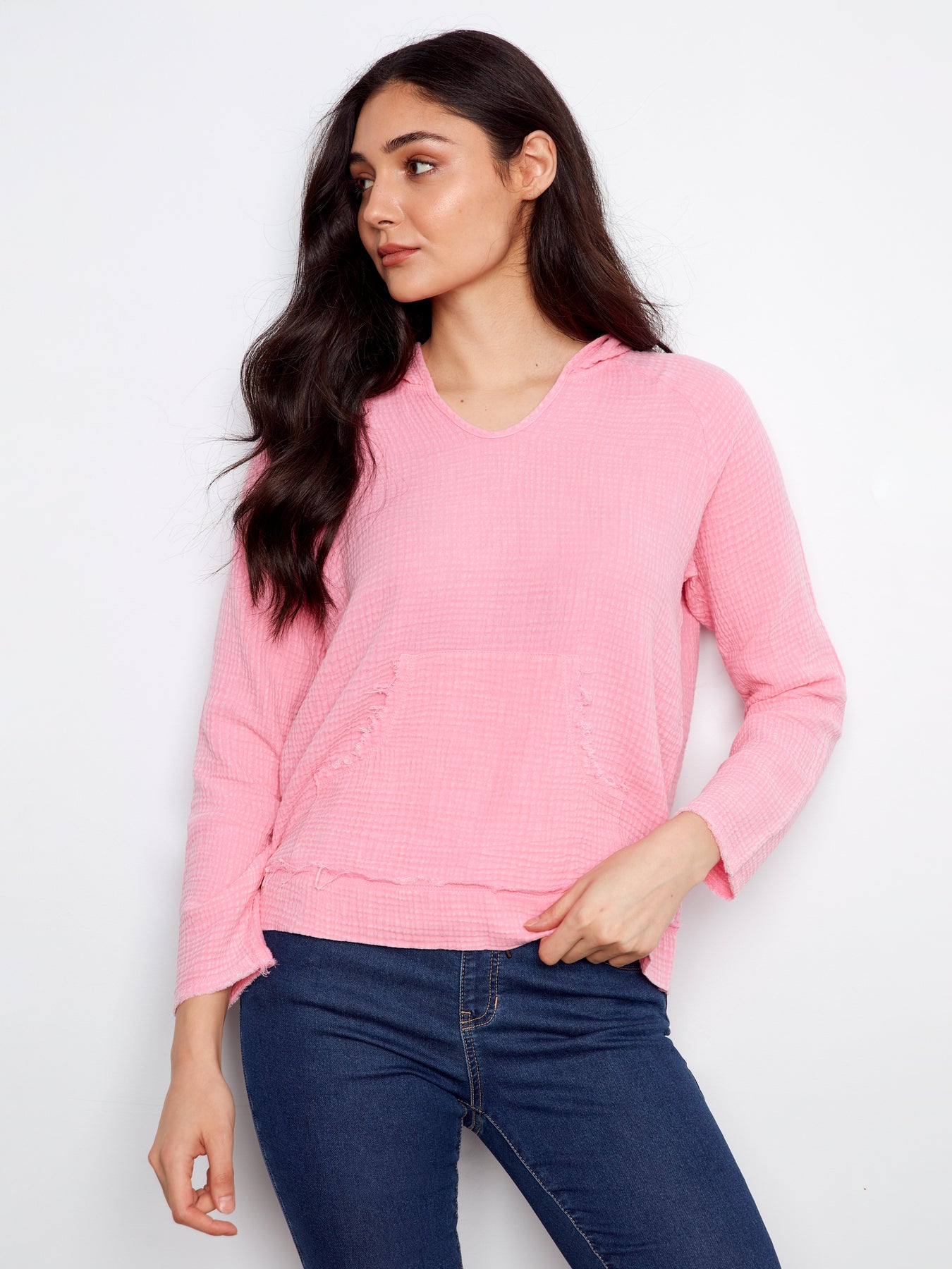 Retro Vibe! Long sleeve 100% Cotton hoodie. Soft and comfortable bubble texture. Flattering open V-neckline. Frayed seam detail and kangaroo pocket. Throw on and go!