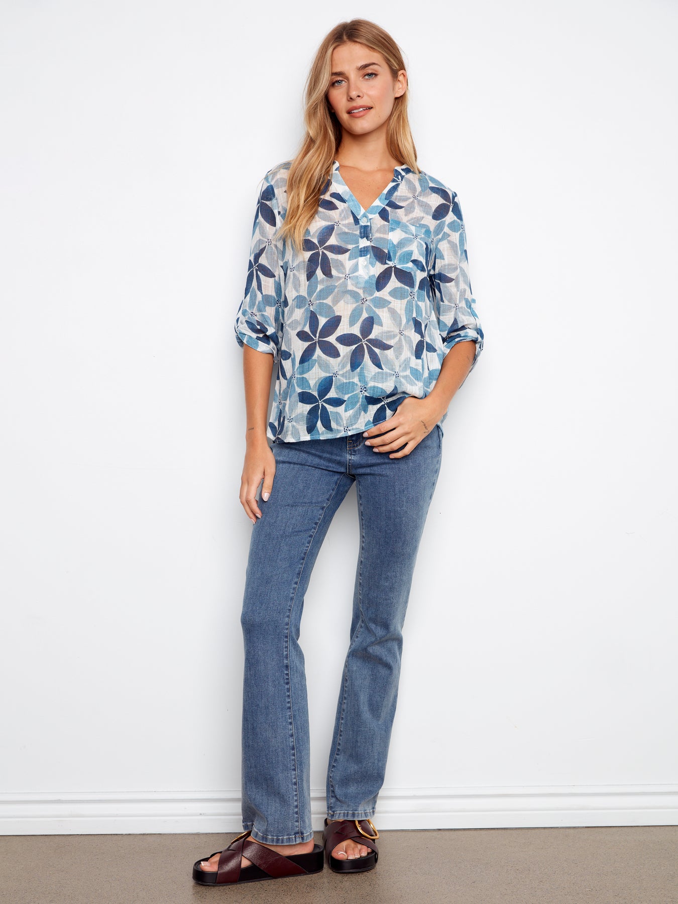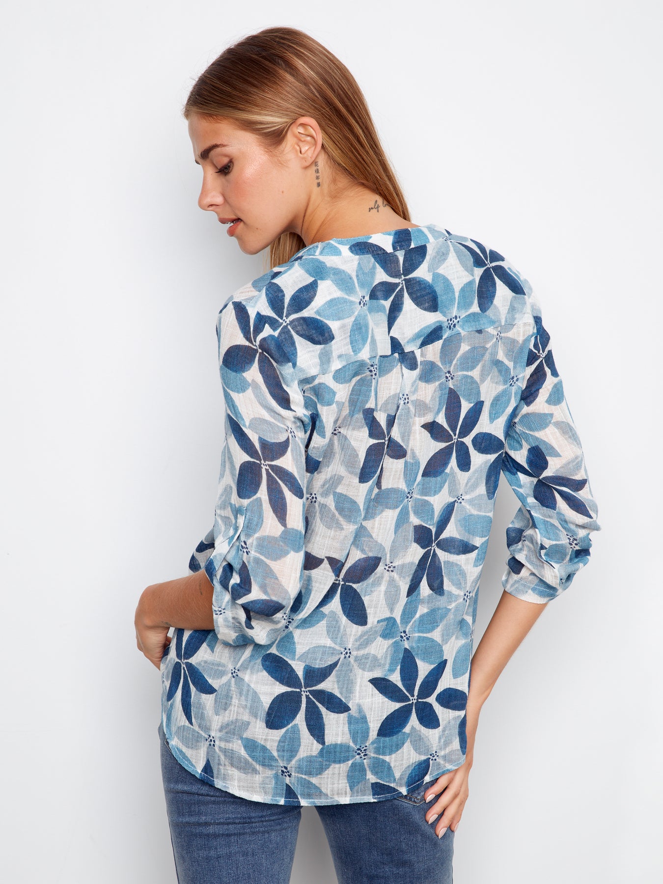 Lightweight and airy popover half-button cotton gauze blouse. Front pocket. Roll-up sleeves are perfect for spring or summer weather. Popular easy-to-wear style. Pretty and practical!