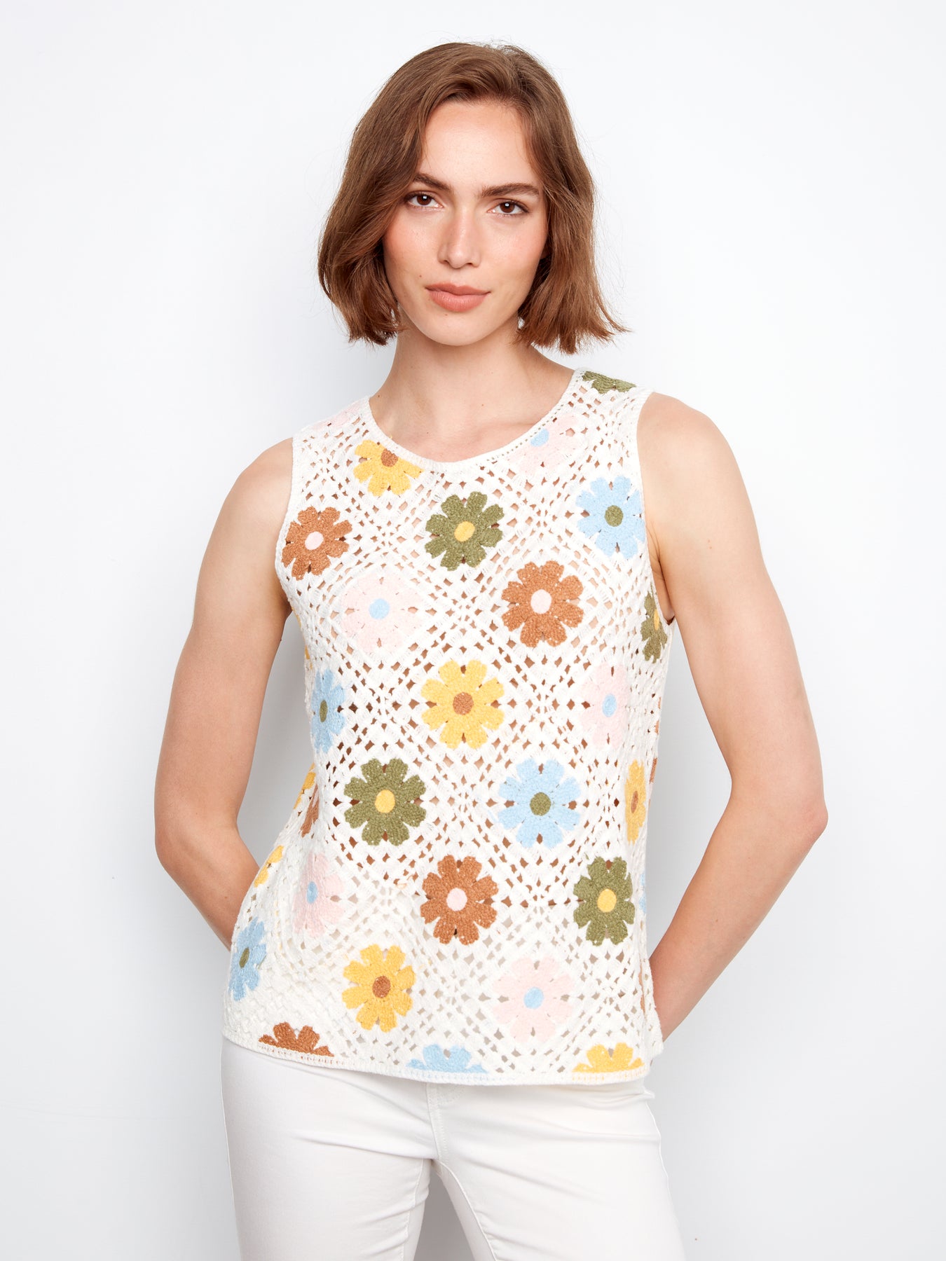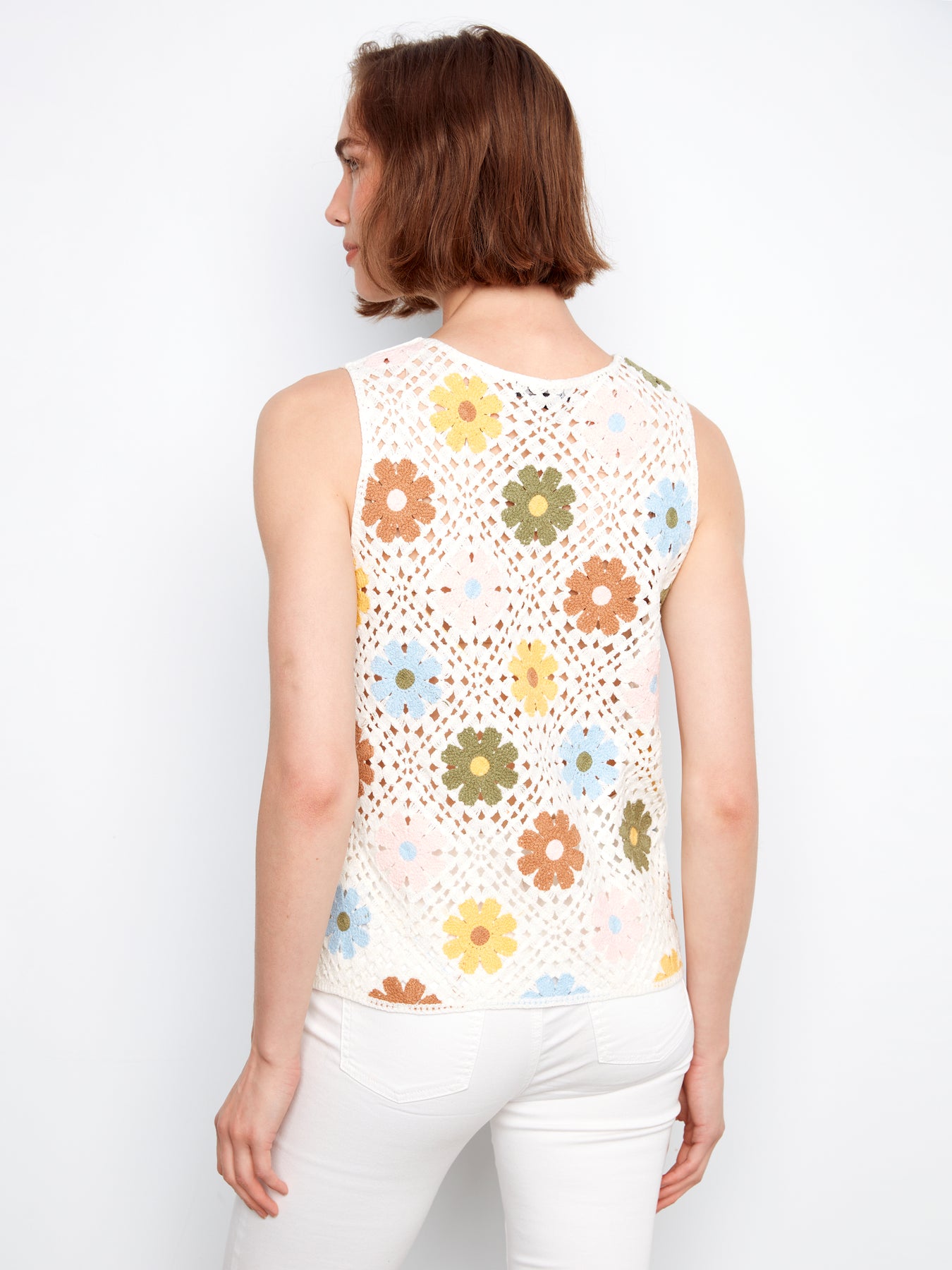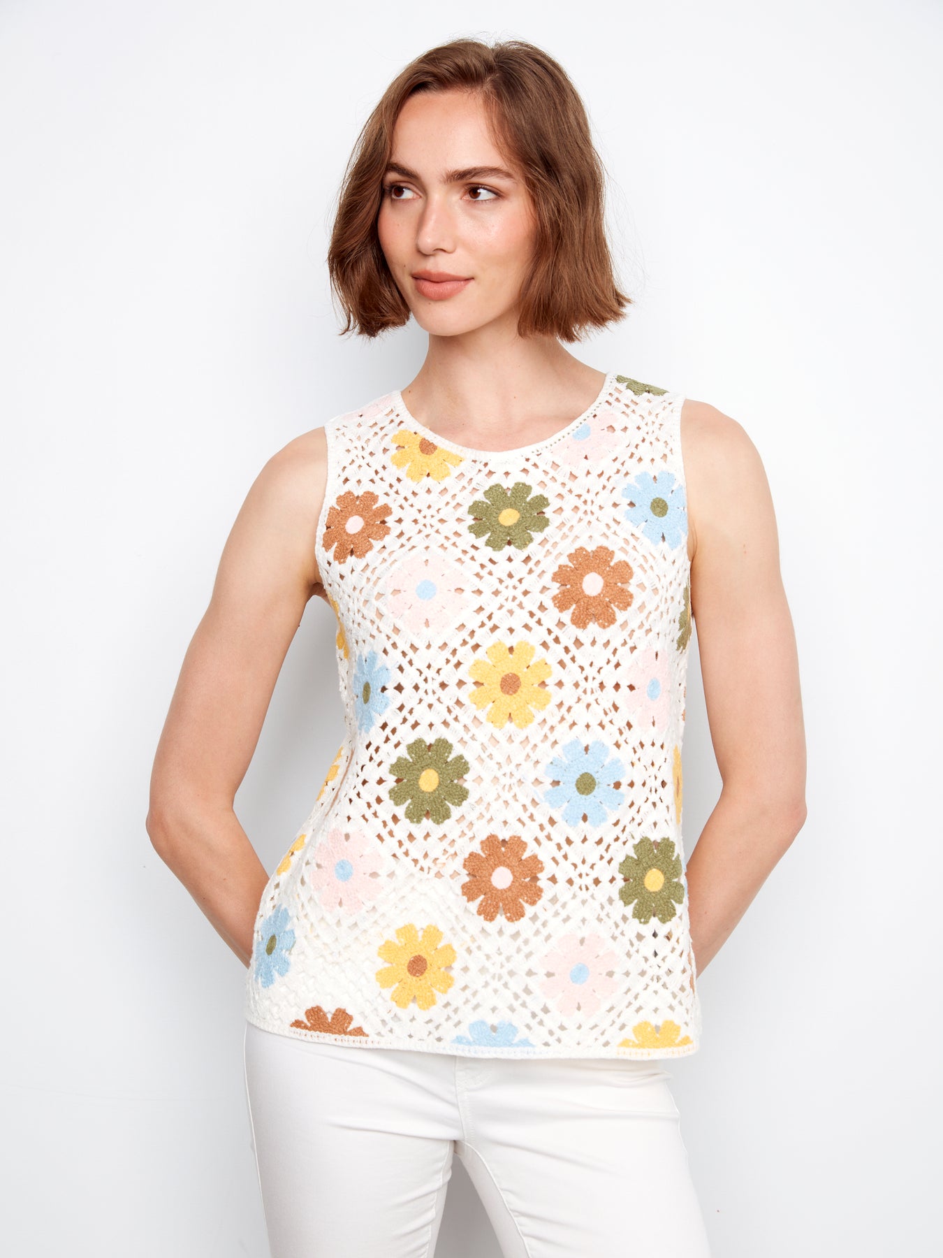 Flower Power! Fun and fabulous lightweight crochet top with colourful flower design. Scalloped border. Sleeveless. Throw on over a basic tank and go. Great with skirts, shorts or pants!